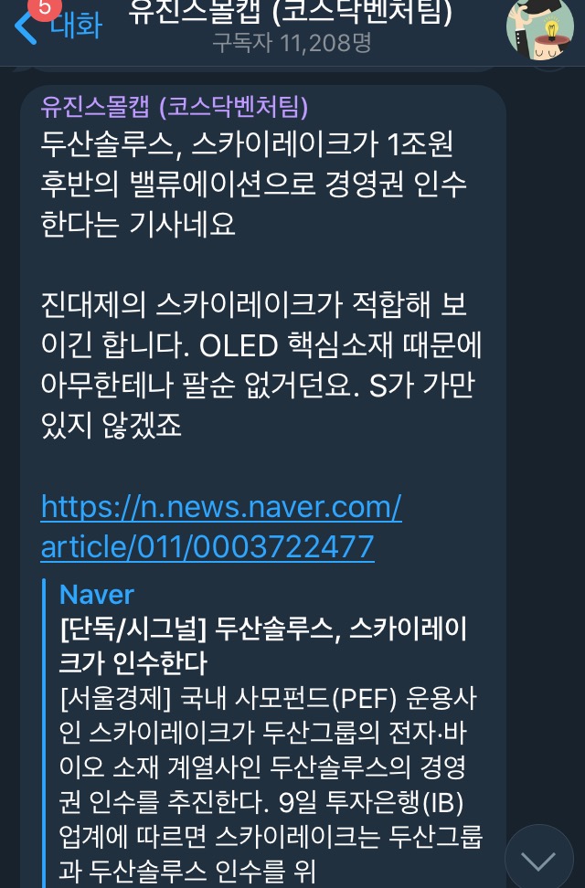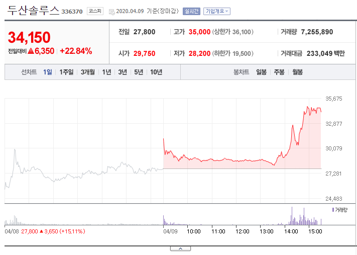 금일 두산그룹의 알짜배기로 평가 받던 두산솔루스의 매각설이 나오면서 장 막판에 급등을 했습니다.